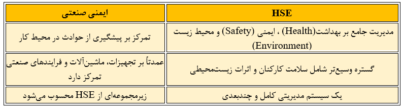 ایمنی صنعتی بخشی از سیستم HSE است. HSE شامل بهداشت، ایمنی و محیط زیست است اما ایمنی صنعتی فقط بر پیشگیری از حوادث تمرکز دارد.